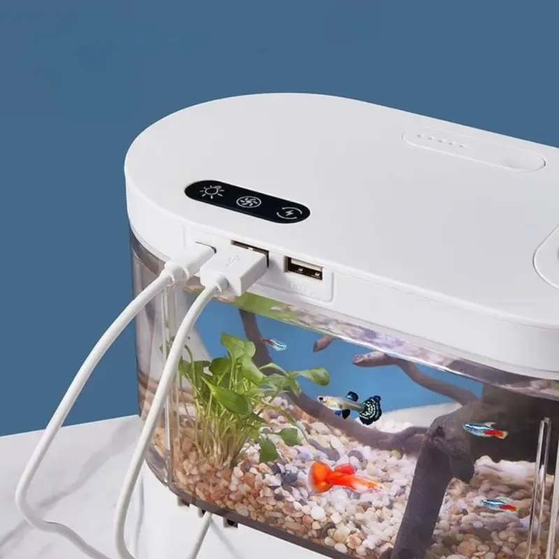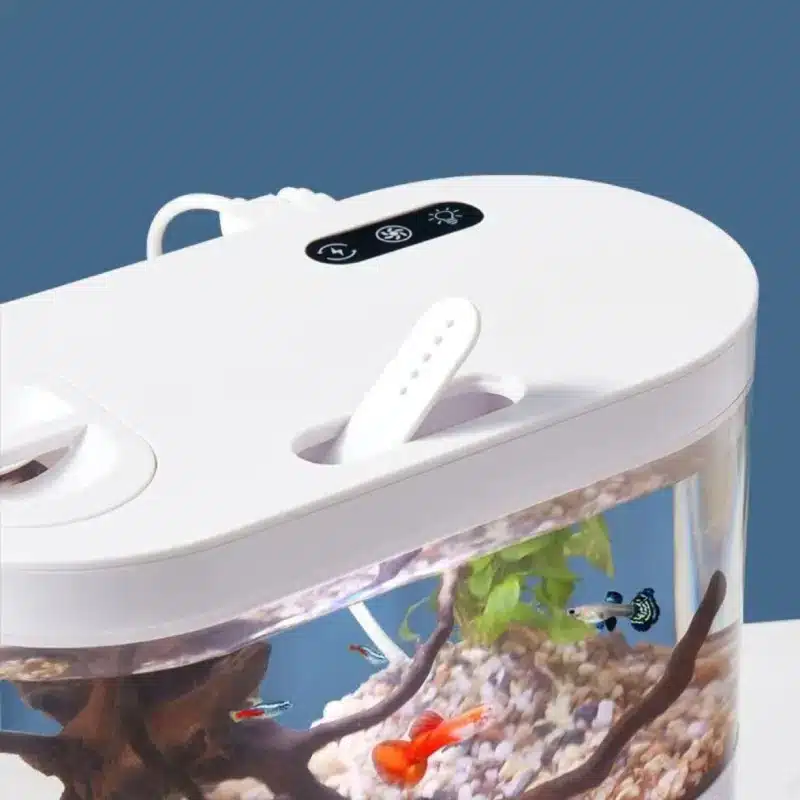 L’Éclairage LED intégré crée une lumière douce qui met vos poissons en valeur et apaise l’ambiance sur le bureau. Adapté pour 3 à 5 petits poissons : assez d’espace pour nager, sans encombrer votre table. La taille compacte tient sur une étagère ou un coin de plan de travail (environ 21 cm × 10,9 cm × 19,2 cm).