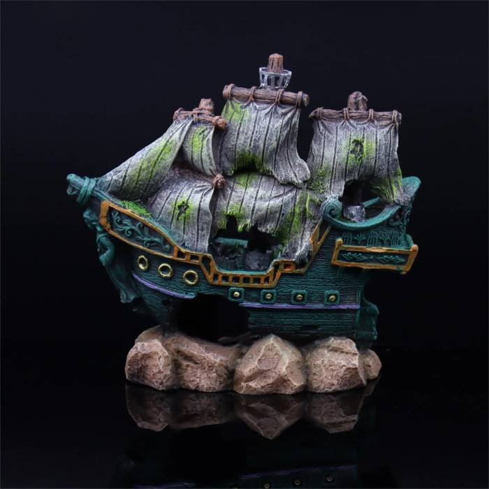 Voici une décoration qui change tout dans un aquarium : le bateau pirate pour aquarium avec rochers a un look ancien, comme une vraie épave oubliée sous l’eau. Ses voiles déchirées, sa coque abîmée et sa peinture avec effets mousseux lui donnent un style pirate réaliste qu’on remarque tout de suite. Placé au fond du bac, il attire l’œil et transforme l’aquarium en scène d’aventure.