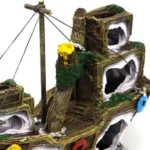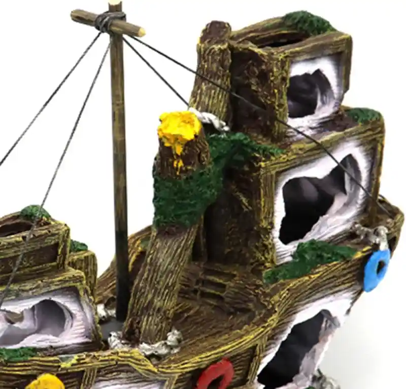 Ajoutez du caractère à votre bac avec notre décoration bateau aquarium rocailleuse. Son aspect de vieux navire abîmé par le temps attire tout de suite l’attention. Les détails en relief, les trous, les cordages et les couleurs vives rendent le décor vivant, comme si une histoire se racontait au fond de l’eau.
