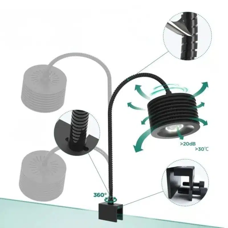 Appréciez un fonctionnement discret et fiable. Le système de refroidissement en aluminium avec ventilateur silencieux maintient une température stable avec un bruit inférieur à 20 dB. Vous profitez de votre aquarium dans le calme.