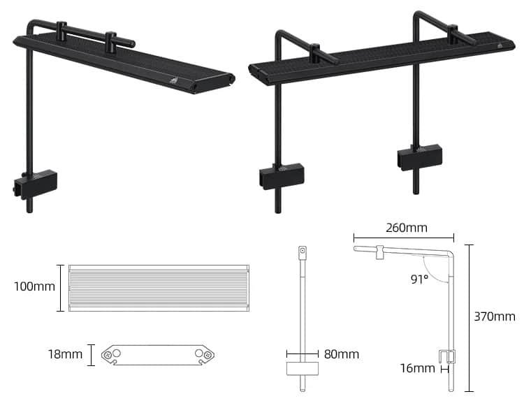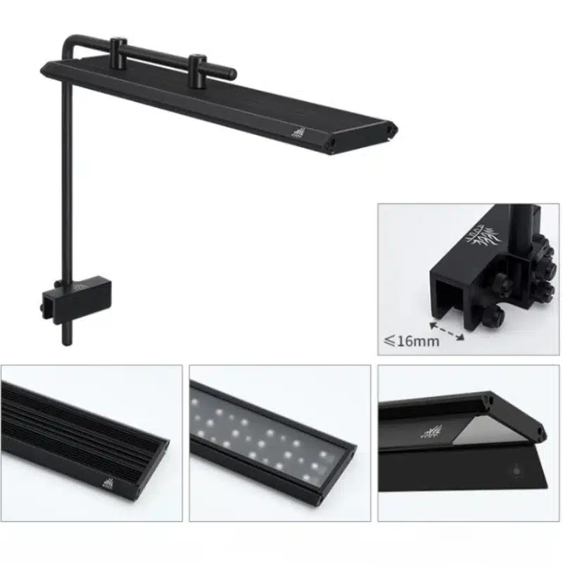 Profitez d’une fixation premium ajustable qui s’adapte facilement à votre aquarium, même avec des vitres jusqu’à 16 mm. Montez, descendez ou avancez la lampe en un geste et trouvez la hauteur parfaite pour booster la croissance de vos plantes.