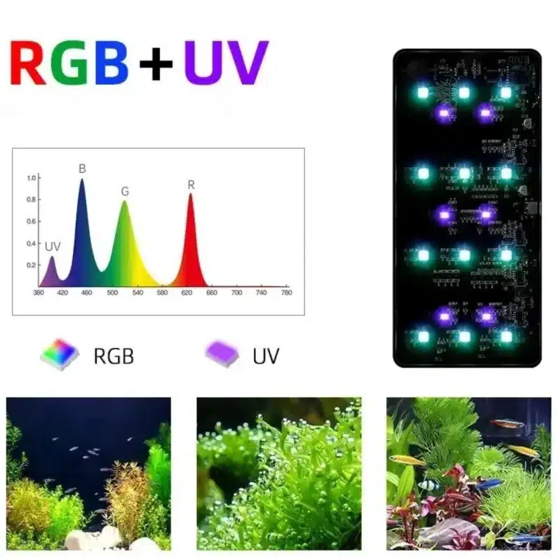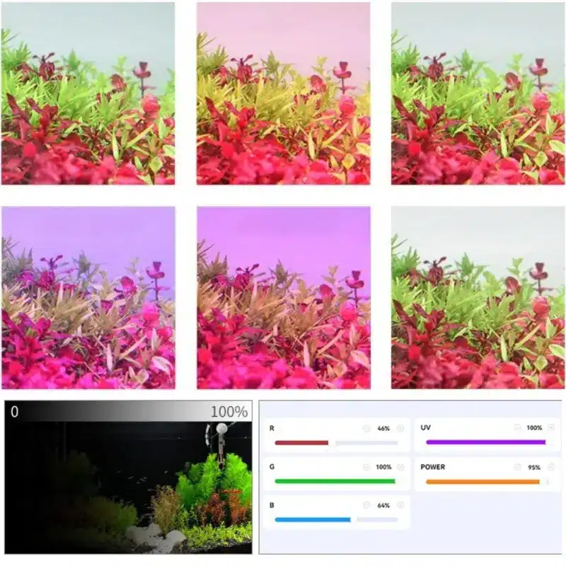 Profitez d’une lumière Full Spectrum RGB + UV, pensée pour donner des couleurs plus intenses à vos poissons et pour aider vos plantes à pousser avec force. Vous choisissez l’ambiance qui vous plaît : rouge, vert, mixte, coloré ou mode croissance. Réglez l’intensité de 1 % à 100 % pour créer une atmosphère douce le soir ou un éclairage puissant en journée. Vous gagnez un contrôle total sur votre éclairage.