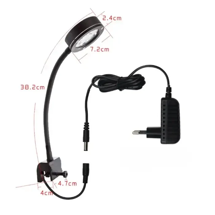 Le design est compact et discret : la tête mesure seulement 7,2 cm de large pour 2,4 cm d’épaisseur. Le bras de 38,2 cm permet un bon dégagement sans prendre de place. Le kit est complet avec interrupteur, câble, transformateur et prise EU. Vous branchez, vous allumez, ça fonctionne.