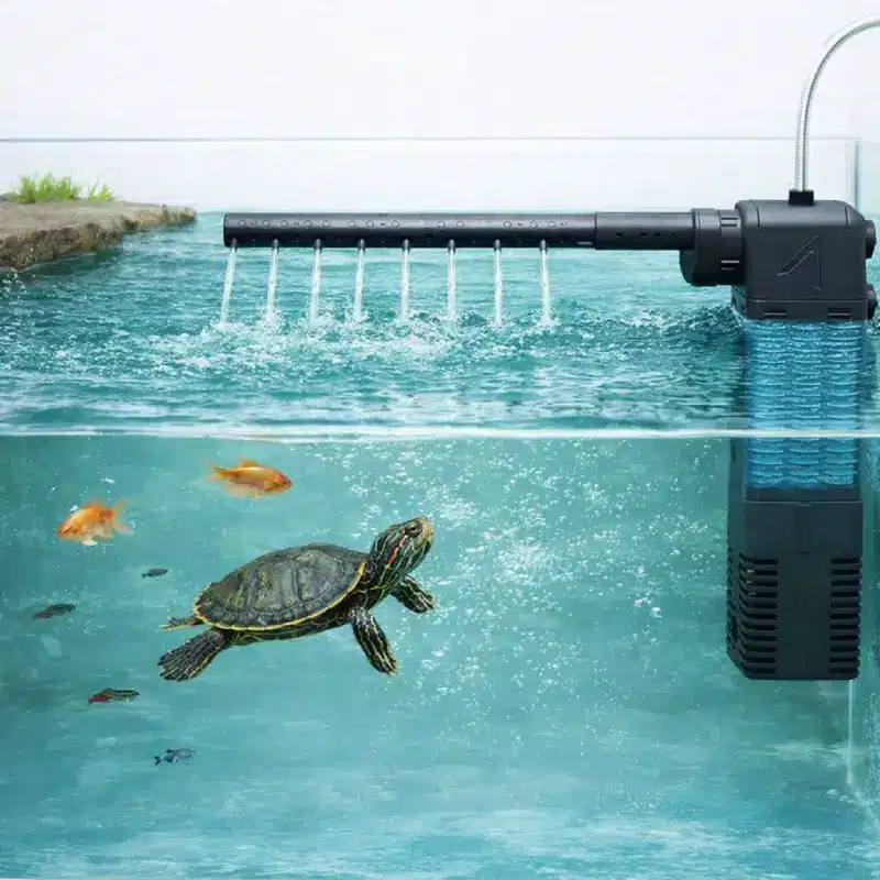 Dans la boîte, vous recevez tout ce qu’il faut : filtre complet avec mousse bleue, barre de pluie orientable, tuyau d’oxygénation, 4 à 5 ventouses et un guide imagé. Ce système convient aux poissons rouges, guppys, bettas, crevettes ou tortues d’eau douce. Il aide aussi à limiter les algues en évitant que l’eau de surface ne stagne.