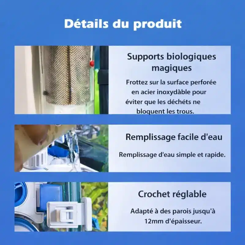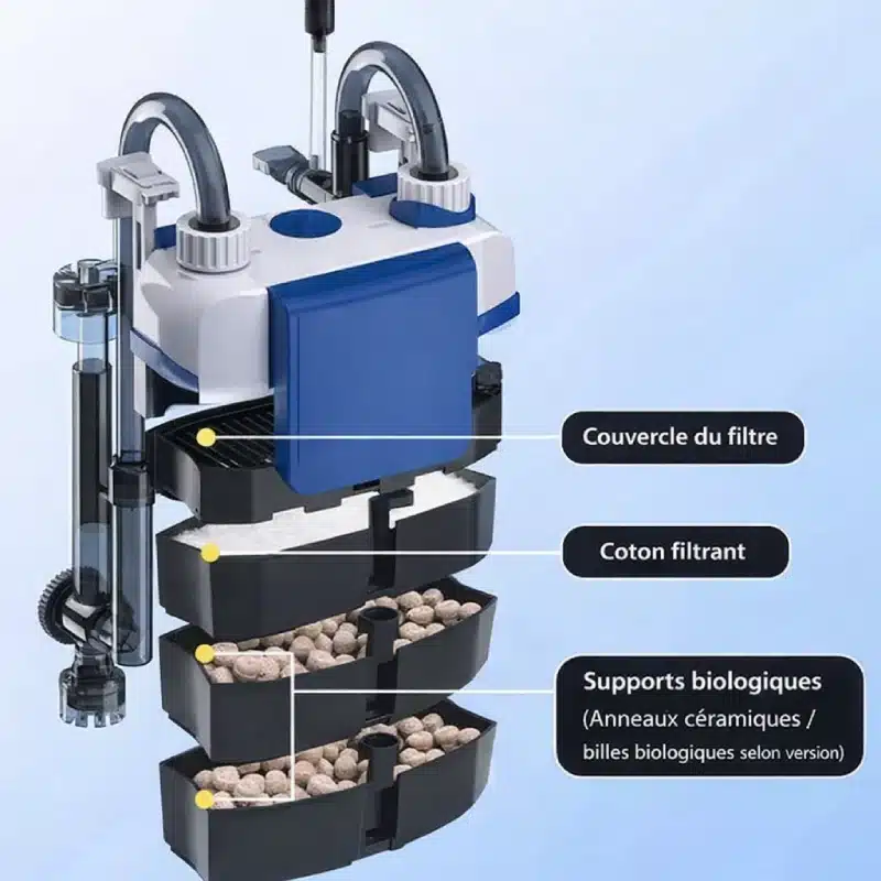 Profitez d’un appareil simple à installer qui se fixe directement sur le bord du bac. Plus besoin de bricoler ou d’occuper de la place inutile à l’intérieur de l’aquarium. Son format compact vous permet de garder toute la beauté de votre décor visible, tout en offrant une filtration puissante et discrète.