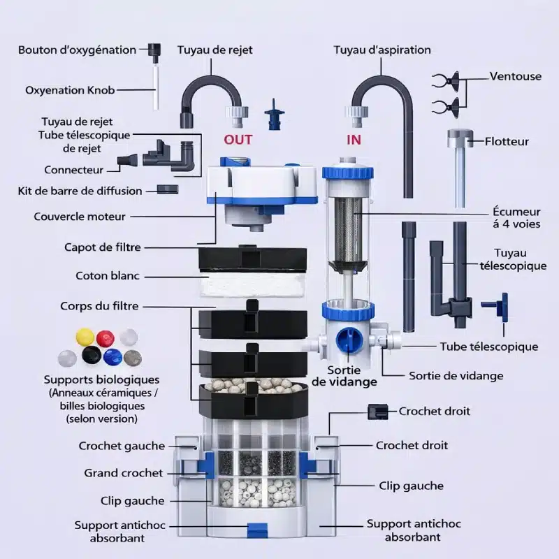 Offrez un environnement stable et sûr à vos poissons tropicaux, crevettes ou tortues. Idéal pour les aquariums de 50 à 120 litres, avec une marge jusqu’à 150 L si la population est légère, le Filtre externe Aquarium 100L Pompe 500L/h est un véritable allié pour profiter d’un bac clair, vivant et agréable à regarder chaque jour.