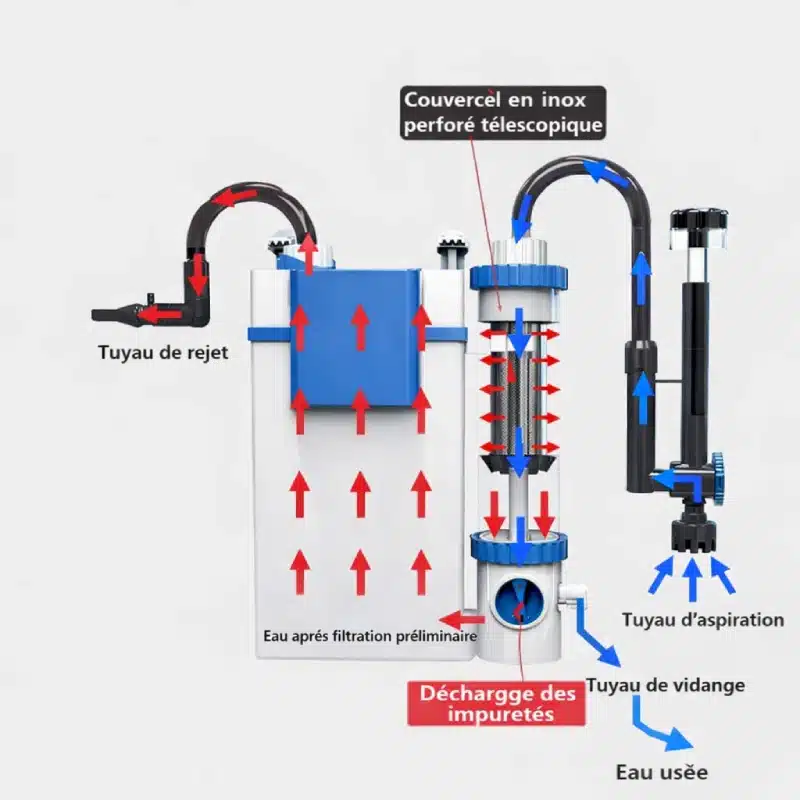 Gagnez du temps à chaque entretien. Le filtre dispose d’une vidange intégrée qui vous permet d’évacuer l’eau sale rapidement, sans tout démonter. Avec son couvercle inox, il reste propre et durable, tandis que son câble de 1,3 m et son support pour vitres jusqu’à 12 mm facilitent l’installation.
