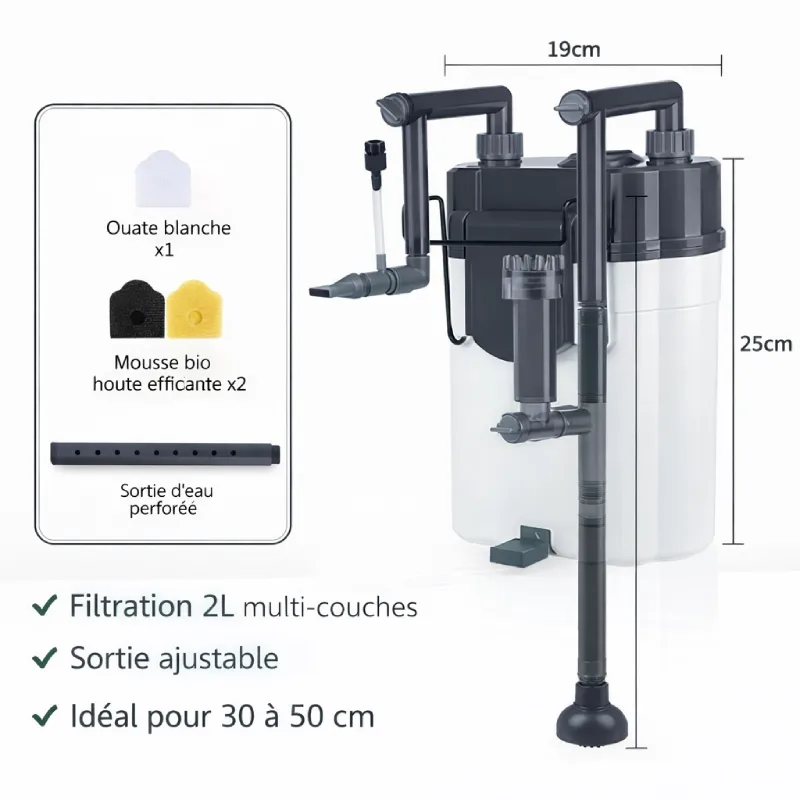 Fixez ce Filtre Externe Nano Aquarium 20-40L sur le bord et gardez l’intérieur du bac plus libre, sans gros bloc au milieu du décor. Son format compact trouve sa place sans effort, et son compartiment de filtration de 2 litres offre une vraie réserve pour retenir les saletés du quotidien. L’eau passe par un circuit en plusieurs couches avec mousse et filtration biologique, ce qui aide à garder une eau plus claire et plus agréable à regarder.