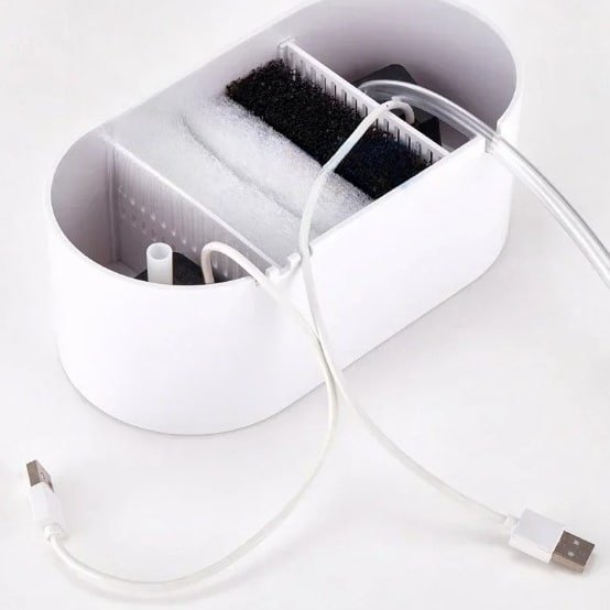 Sous la cuve, la filtration intégrée avec mousses travaille discrètement pour garder une eau propre. La pompe USB fournie assure un fonctionnement silencieux, idéal pour travailler, étudier ou vous détendre sans distraction. Branchez, remplissez, allumez… et tout fonctionne tout de suite.