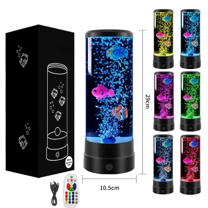 Avec sa taille compacte de 29 cm de hauteur et 10,5 cm de diamètre, vous pouvez la poser facilement sur une table de nuit, une étagère ou un bureau. Ses LED multicolores illuminent l’eau en changeant de teinte selon vos envies. Vous avez envie d’un bleu profond, d’un vert relaxant ou d’un violet mystérieux ? La télécommande incluse vous permet de choisir la couleur et l’intensité sans bouger de votre fauteuil. L’effet aquarium est renforcé par des poissons réalistes qui semblent nager en rythme avec les bulles.