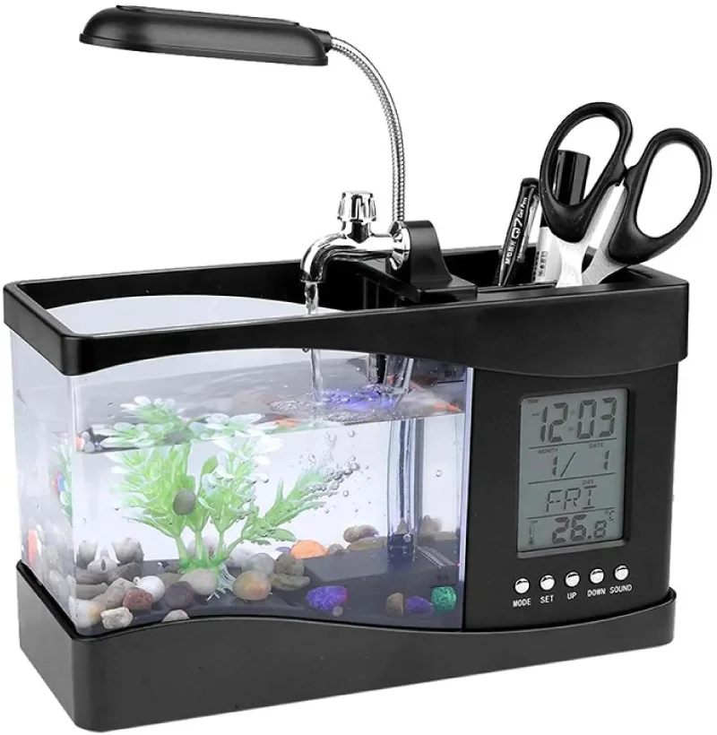 Créez une vraie ambiance zen sur votre bureau avec ce mini-aquarium multifonction avec lampe LED, fontaine et rangement intégré. Le petit aquarium 3l de bureau avec horloge offre une partie transparente pour l’eau et les plantes, idéale pour ajouter une touche de nature près de votre espace de travail. Profitez d’un format compact de 24 cm x 10 cm x 14 cm, pensé pour se glisser sur un coin de table ou de bureau sans prendre de place. L’ensemble propose un design moderne et épuré qui s’intègre bien dans un intérieur contemporain.