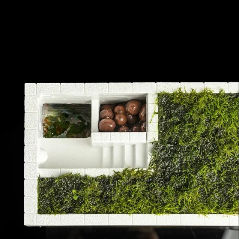L’eau monte vers le couvercle grâce à un système de filtration intégré avec billes bio et zones pour plantes. La pompe reste cachée, ce qui garde un aquarium propre, silencieux et agréable à regarder. Selon le modèle, vous profitez aussi d’un effet brume qui couvre la mousse d’une vapeur légère et renforce l’effet décoratif.