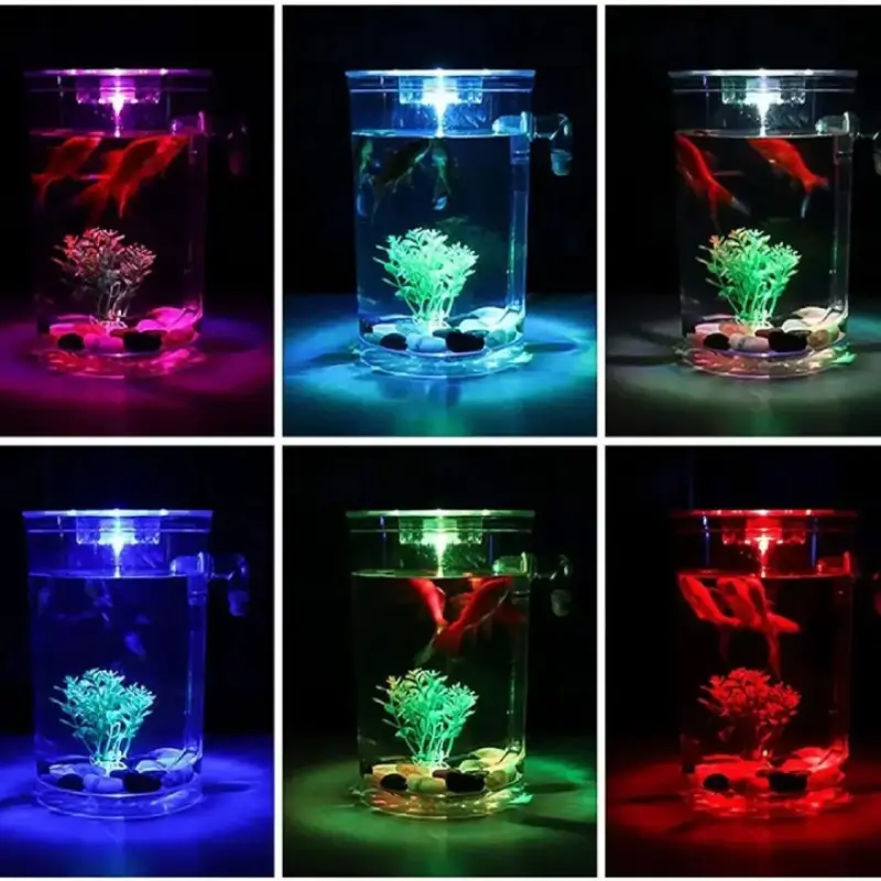 L’éclairage LED multicolore crée une atmosphère douce et relaxante. Il fonctionne avec une pile bouton intégrée, sans fil ni branchement, pour un usage mobile. Vous pouvez ainsi poser votre mini aquarium où vous le souhaitez, sans dépendre d’une prise électrique.