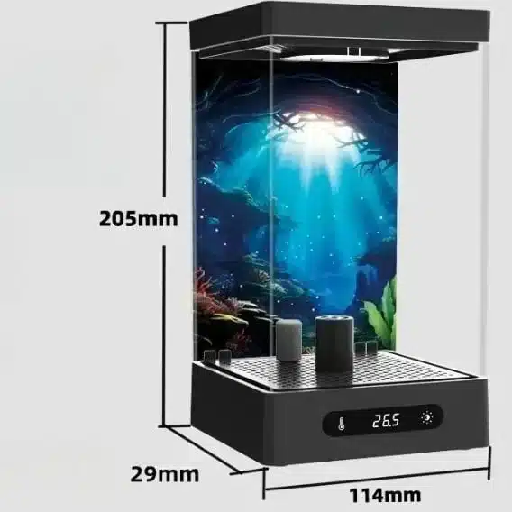 Avec son format compact de 3 L, cet aquarium s’installe facilement sur un bureau, une table ou une étagère. Il attire le regard sans prendre de place. Sa lumière LED multicolore sublime les reflets du poisson et crée une ambiance douce et relaxante. C’est un vrai plaisir visuel au quotidien, parfait pour apaiser l’esprit après une longue journée.