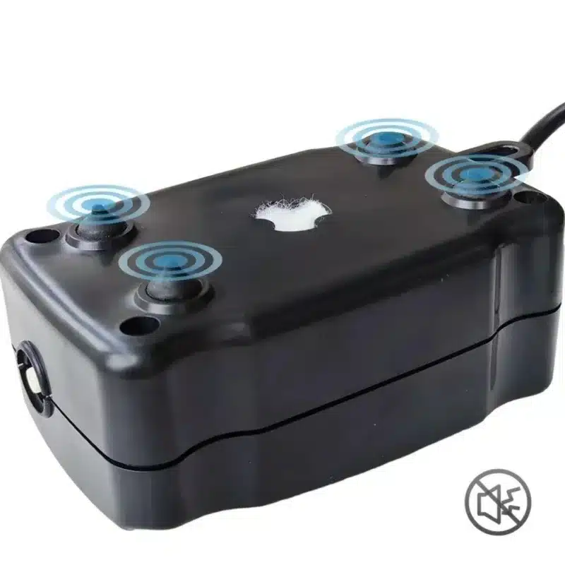 Un bouton discret placé sur le côté permet de régler le débit en deux positions : 50 % ou 100 %. Vous choisissez ce qui convient le mieux à votre bac. Sous l’appareil, quatre pieds en caoutchouc empêchent les vibrations. La pompe reste stable, ne glisse pas et fonctionne presque sans bruit, même en pleine nuit.