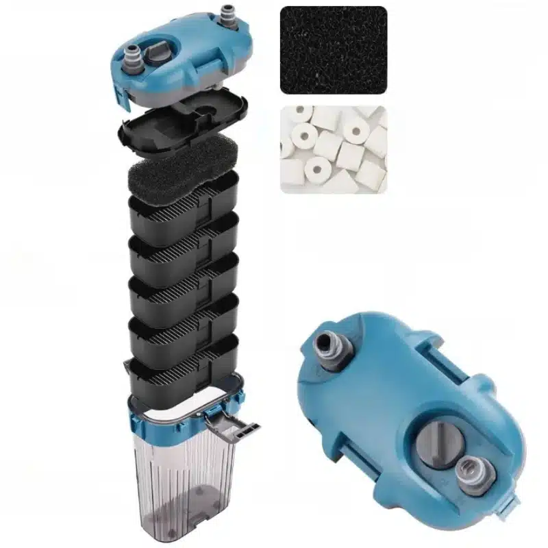 Libérez de la place dans votre bac grâce à une installation suspendue qui se fixe sur le bord. La Pompe Filtre Externe Aquarium 60L Puissante reste à l’extérieur, et votre décor garde un rendu plus net, sans gros bloc qui prend de l’espace dans l’eau. L’eau est aspirée, passe à travers plusieurs compartiments, puis ressort avec une circulation régulière qui change vite l’aspect du bac.